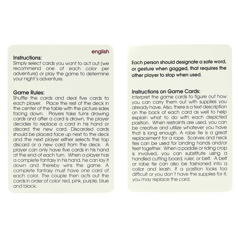 Playfully kinky sex position cards! Compete against your lover to build a five-card fantasy that includes five categories of bondage position challenges. The cards can also be used as flash cards for ideas of sex positions you can experiment with that incorporate bondage.